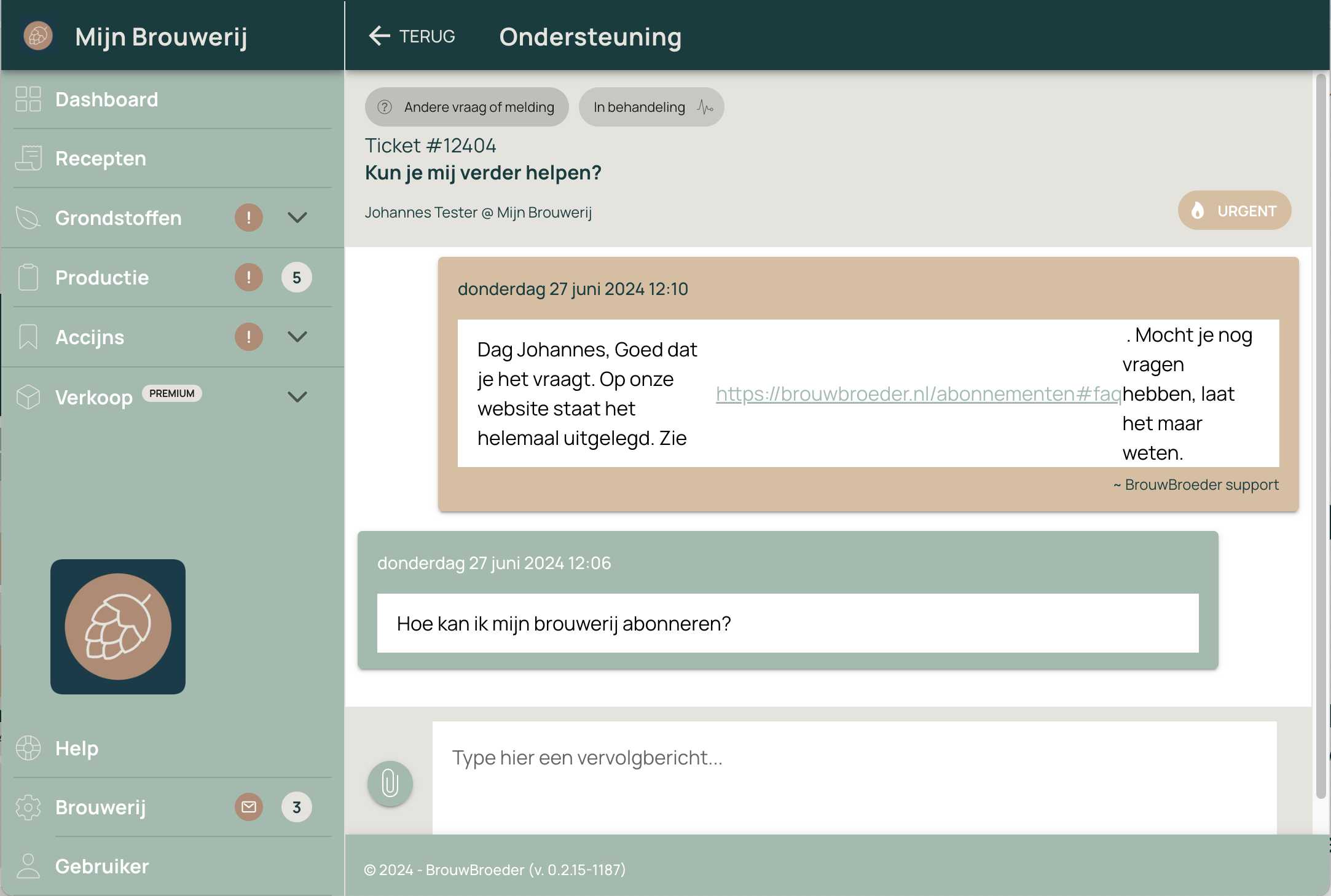 In de BrouwBroeder-App kan je bij Helpdesk -> Tickets gemakkelijk een ticket aanmaken ter ondersteuning, waar wij dan weer makkelijk op kunnen reageren. Je kunt daar ook eenvoudig screenshots toevoegen, om je punt nog duidelijker te kunnen maken.